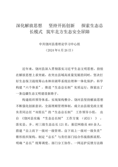 党组学习:20240626深化解放思想 坚持开拓创新 探索生态总长模式 筑牢北方生态安全屏障——中共饶河县委理论学习中心组