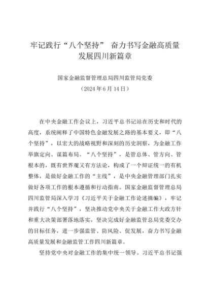 / 党组学习:20240614牢记践行“八个坚持” 奋力书写金融高质量发展四川新篇章——国家金融监督管理总局四川监管局党委