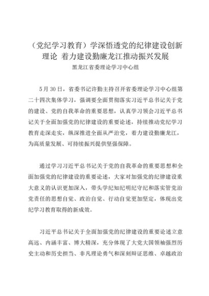 党组学习:20240530(党纪学习教育)学深悟透党的纪律建设创新理论 着力建设勤廉龙江推动振兴发展——黑龙江省委理论学习中心组