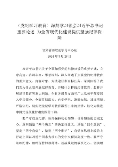 党组学习:20240528(党纪学习教育)深刻学习领会习近平总书记重要论述 为全省现代化建设提供坚强纪律保障——甘肃省委理论学习中心组