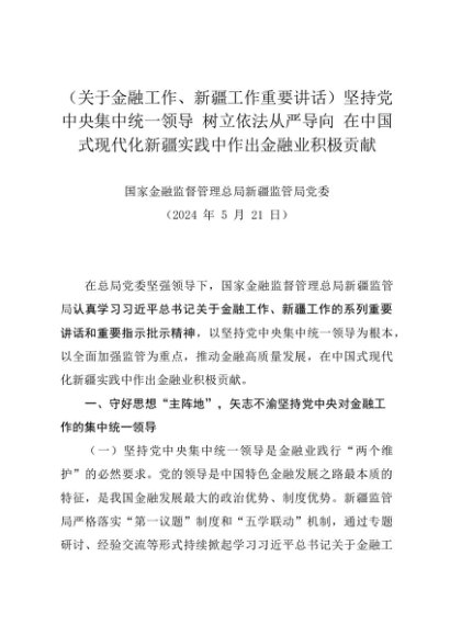 党组学习:20240521(关于金融工作、新疆工作重要讲话)坚持党中央集中统一领导 树立依法从严导向 在中国式现代化新疆实践中作出金融业积极贡献——国家金融监督管理总局新疆监管局党委