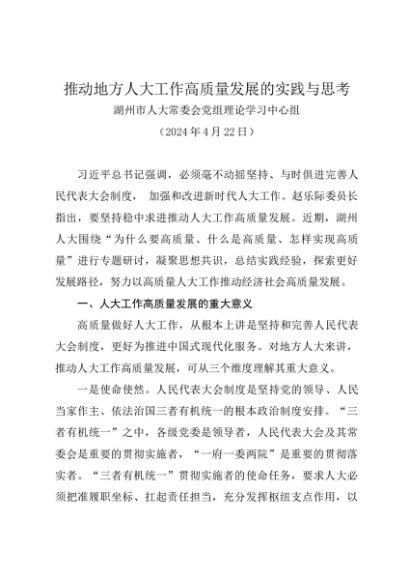 党组学习:20240422推动地方人大工作高质量发展的实践与思考——湖州市人大常委会党组理论学习中心组