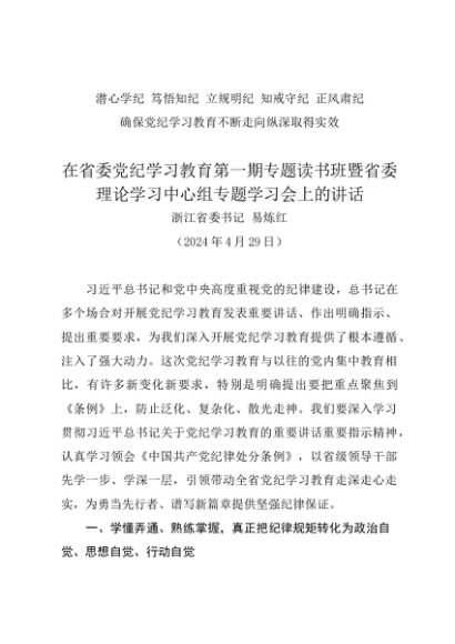 党组学习:20240429(党纪学习教育)在省委党纪学习教育第一期专题读书班暨省委理论学习中心组专题学习会上的讲话——浙江省委书记 易炼红