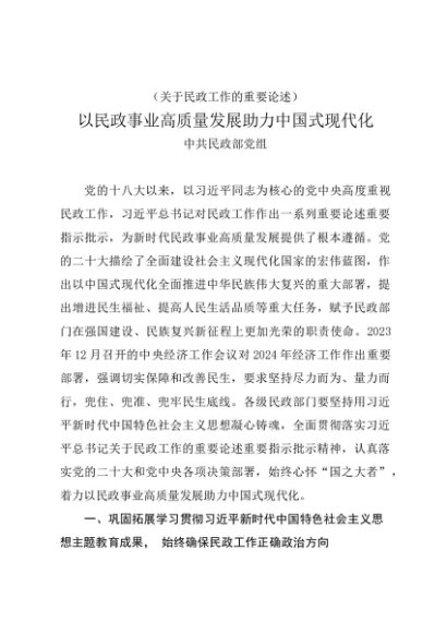 党组学习:20240130(关于民政工作的重要论述)以民政事业高质量发展助力中国式现代化——民政部党组