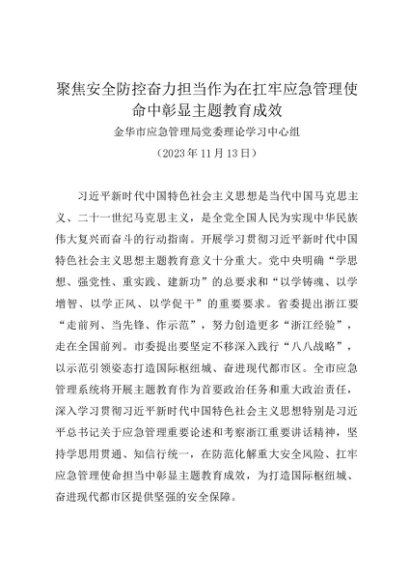党组学习:20231113聚焦安全防控奋力担当作为在扛牢应急管理使命中彰显主题教育成效——金华市应急管理局党委理论学习中心组