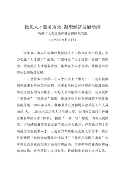 / 党组学习:20230908做优人才服务质效凝聚经济发展动能——乌海市人力资源和社会保障局党组