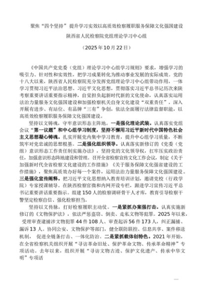 党组学习:20251022聚焦“四个坚持”提升学习实效以高质效检察履职服务保障文化强国建设——陕西省人民检察院党组理论学习中心组