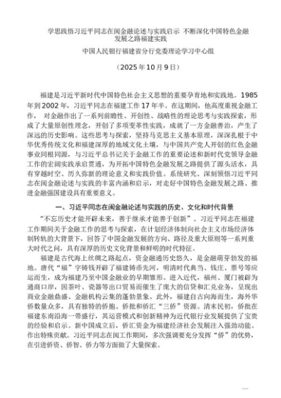 党组学习:20251009学思践悟习近平同志在闽金融论述与实践启示 不断深化中国特色金融发展之路福建实践——中国人民银行福建省分行党委理论学习中心组
