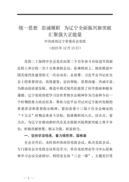 / 党组学习:20251215统一思想 忠诚履职 为辽宁全面振兴新突破汇聚强大正能量——中共政协辽宁省委员会党组