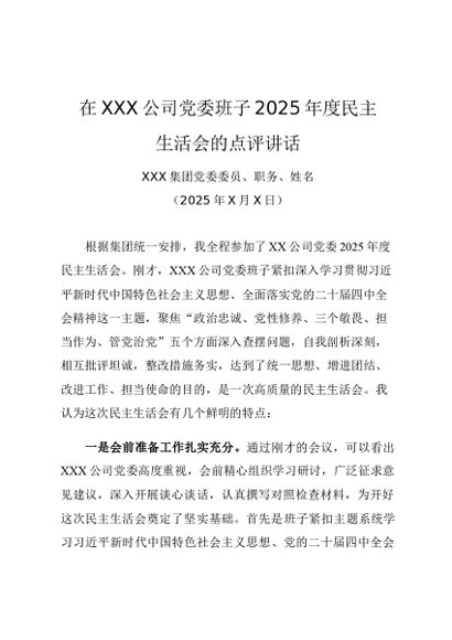 / 党建原创:2026-0002 在XXX公司党委班子2025年度民主生活会的点评讲话