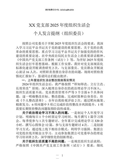 / 党建原创:2026-0026 XX党支部2025年度组织生活会个人发言提纲(组织委员)