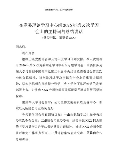 / 党建原创:2026-0017 在党委理论学习中心组2026年第X次学习会上的主持词与总结讲话
