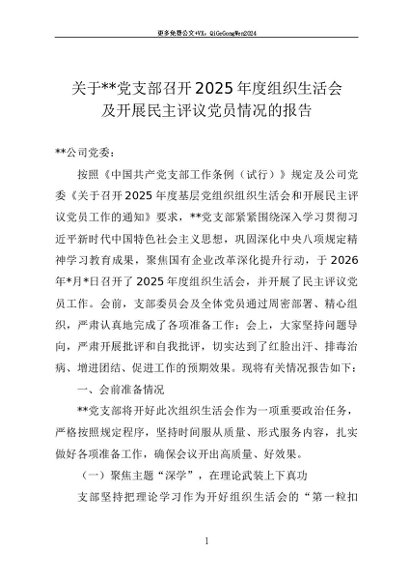 / 党建原创:2026-0044 关于XX党支部召开2025年度组织生活会及开展民主评议党员情况的报告