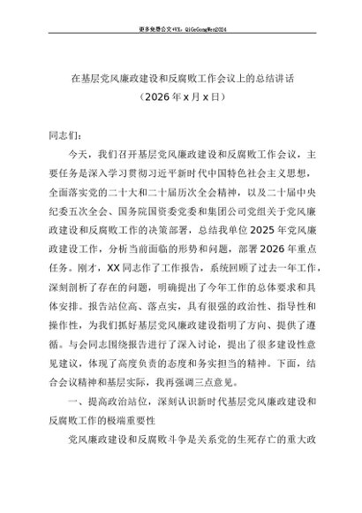 / 党建原创:2026-0030 在基层党风廉政建设和反腐败工作会议上的总结讲话