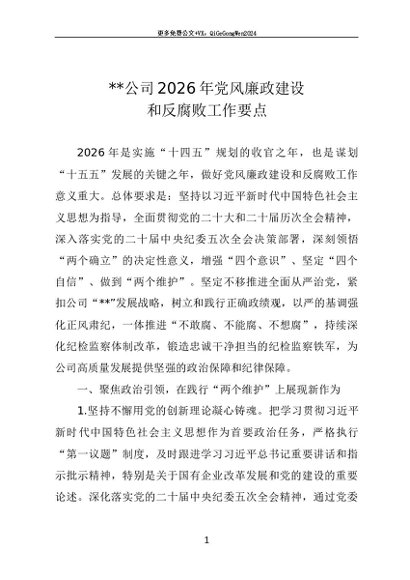 / 党建原创:2026-0037 XX公司2026年党风廉政建设和反腐败工作要点