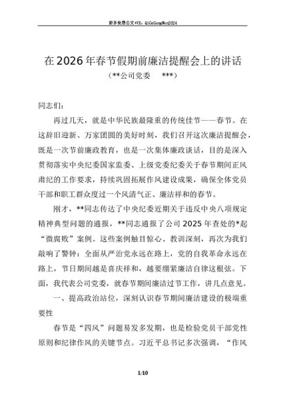 / 党建原创:2026-0031 在2026年春节假期前廉洁提醒会上的讲话