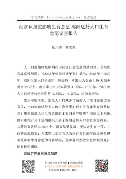 / 调研报告:20240730经济负担重影响生育意愿:绵阳适龄人口生育意愿调查报告