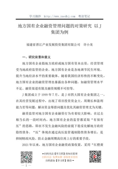 / 调研报告:20240630地方国有企业融资管理问题的对策研究 以J集团为例——福建省晋江产业发展投资集团有限公司