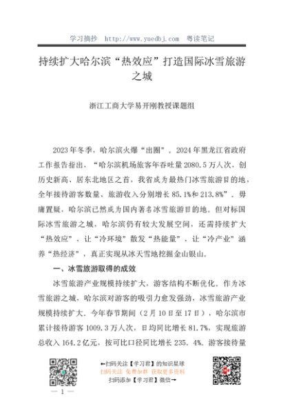 / 调研报告:20240530持续扩大哈尔滨“热效应”打造国际冰雪旅游之城——浙江工商大学易开刚教授课题组
