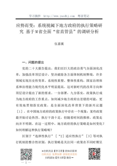 / 调研报告:20240630应势而变:系统视阈下地方政府的执行策略研究 基于M省全面“省直管县”的调研分析