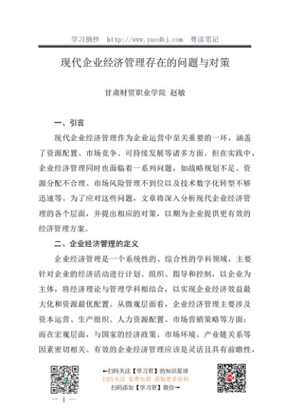/ 调研报告:20240630现代企业经济管理存在的问题与对策——甘肃财贸职业学院