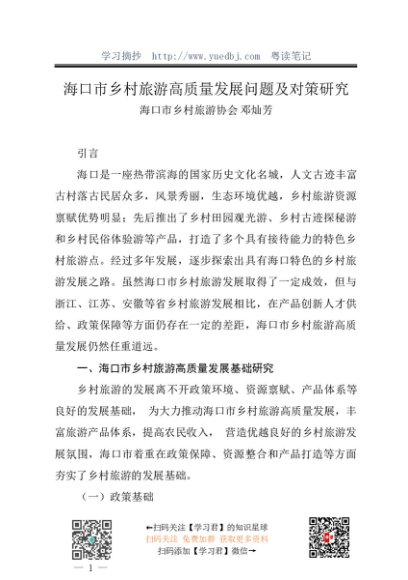 / 调研报告:20240328海口市乡村旅游高质量发展问题及对策研究——海口市乡村旅游协会