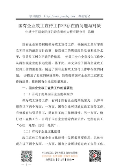 / 调研报告:20240430国有企业政工宣传工作中存在的问题与对策——中铁十五局集团济阳迎宾黄河大桥有限公司 陈鹏
