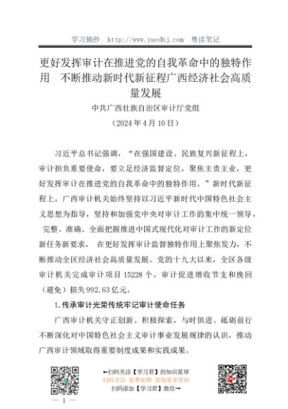 调研报告:20240410更好发挥审计在推进党的自我革命中的独特作用 不断推动新时代新征程广西经济社会高质量发展——广西壮族自治区审计厅党组
