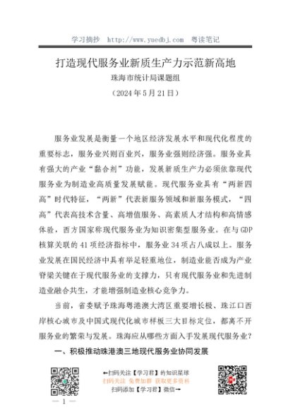 / 调研报告:20240521打造现代服务业新质生产力示范新高地——珠海市统计局课题组