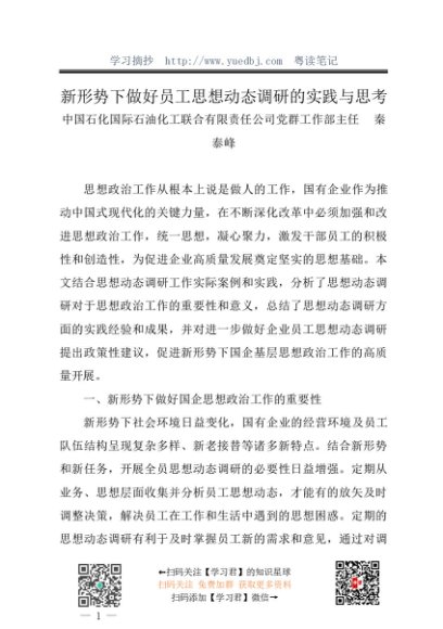 调研报告:20240430新形势下做好员工思想动态调研的实践与思考——中国石化国际石油化工联合有限责任公司党群工作部主任 秦泰峰