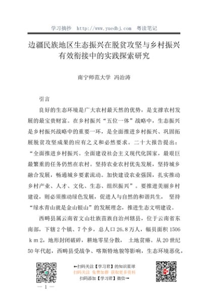/ 调研报告:20240328边疆民族地区生态振兴在脱贫攻坚与乡村振兴有效衔接中的实践探索研究——南宁师范大学 冯治涛