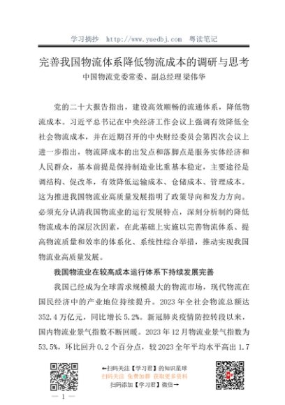 / 调研报告:20240328完善我国物流体系降低物流成本的调研与思考——中国物流党委常委 梁伟华
