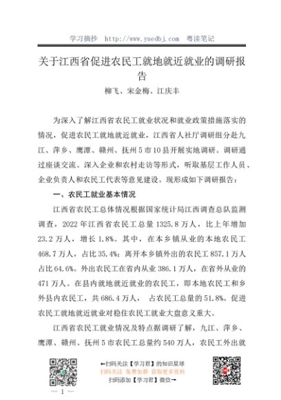 / 调研报告:20231230关于江西省促进农民工就地就近就业的调研报告