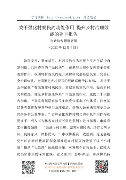 / 调研报告:20231206关于强化村规民约功能作用,提升乡村治理效能的建言报告