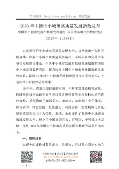 / 调研报告:20231118中国中小城市高质量发展2023年指数发布