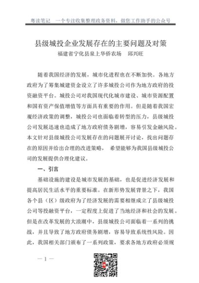 / 调研报告:20230900县级城投企业发展存在的主要问题及对策——宁化县泉上华侨农场