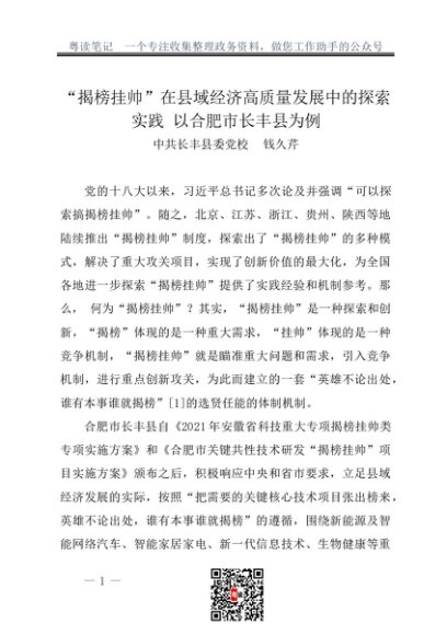 / 调研报告:20230200“揭榜挂帅”在县域经济高质量发展中的探索实践 以合肥市长丰县为例