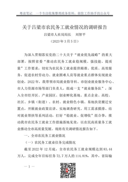 / 调研报告:20230305关于吕梁市农民务工就业情况的调研报告——吕梁市人社局局长