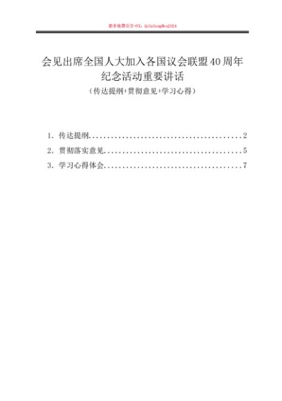 第一议题:20240820会见出席全国人大加入各国议会联盟40周年纪念活动重要讲话(传达提纲+贯彻意见+学习心得)