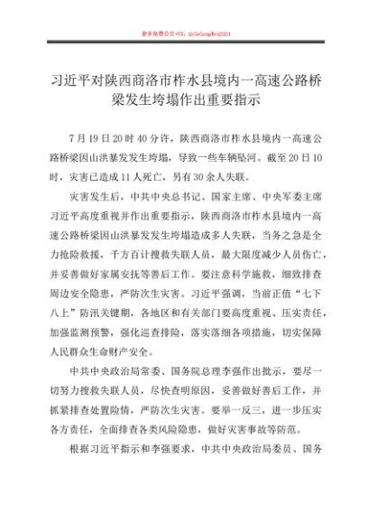 第一议题:20240719习近平关于陕西商洛市柞水县境内一高速公路桥梁发生垮塌重要指示(传达提纲+贯彻意见)
