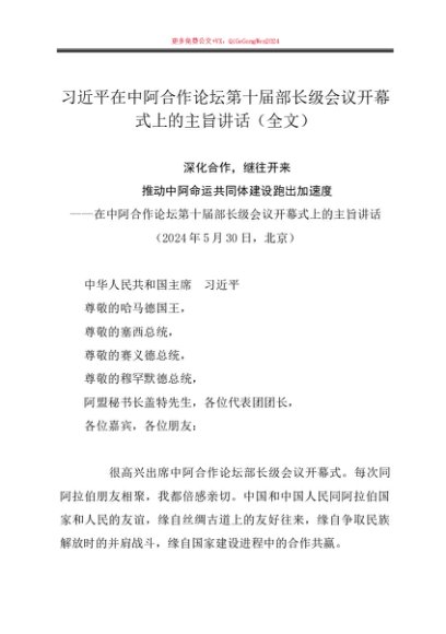 / 第一议题:20240530习近平在中阿合作论坛第十届部长级会议开幕式上的主旨讲话(全文)