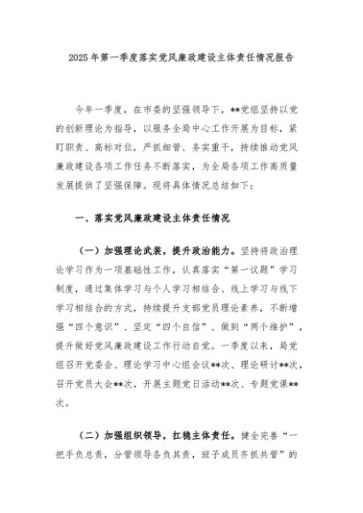 / 工作总结:2025年2025年第一季度落实党风廉政建设主体责任情况报告