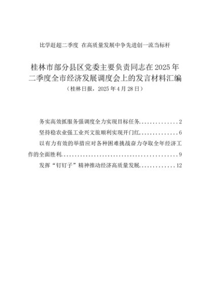 / 交流发言:20250429桂林市部分县区党委主要负责同志在2025年二季度全市经济发展调度会上的发言材料汇编(4篇)