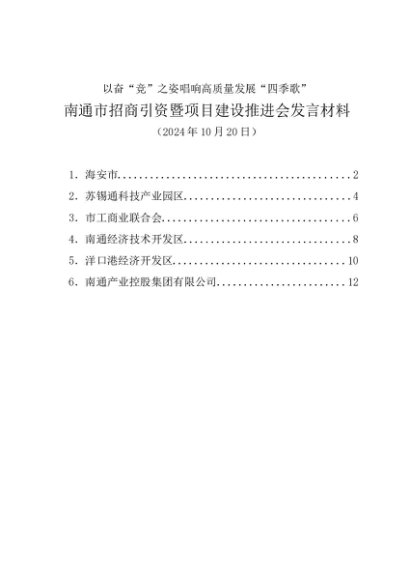 / 交流发言:20241020南通市招商引资暨项目建设推进会(冲刺第四季度)发言材料(6篇)