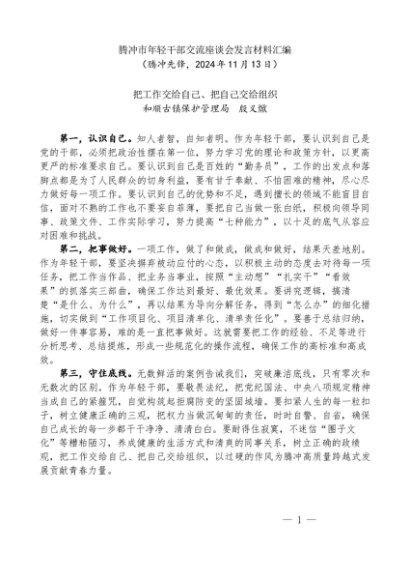 / 交流发言:20241113腾冲市年轻干部交流座谈会发言材料汇编(4篇)