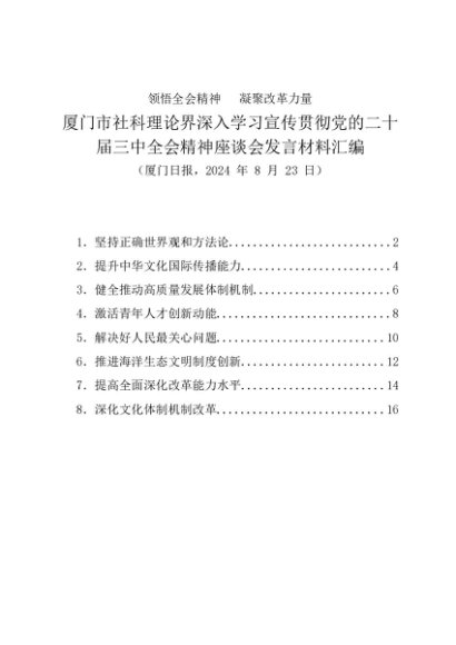 / 交流发言:20240823厦门市社科理论界深入学习宣传贯彻党的二十届三中全会精神座谈会发言材料汇编(8篇)