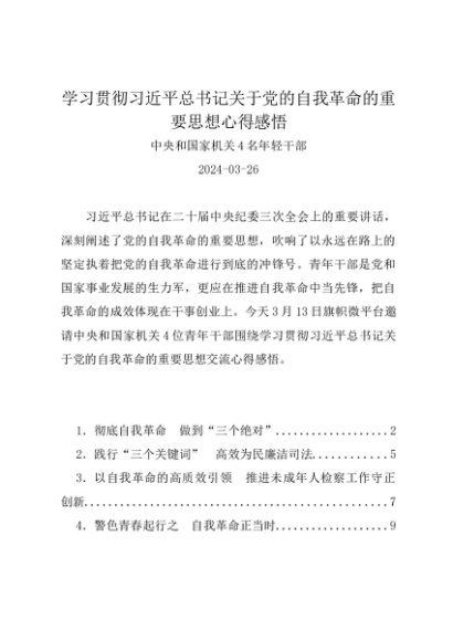 / 交流发言:20240327(党的自我革命)学习贯彻习近平总书记关于党的自我革命的重要思想心得感悟(4篇)