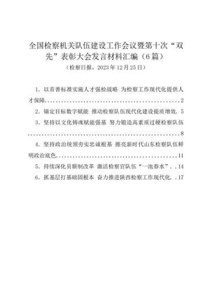 / 交流发言:20231225全国检察机关队伍建设工作会议暨第十次“双先”表彰大会发言材料汇编(6篇)