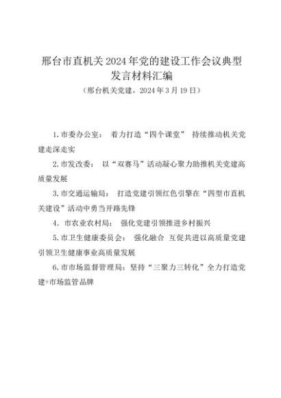 / 交流发言:20240319(党的建设)邢台市直机关2024年党的建设工作会议典型发言材料汇编(6篇)