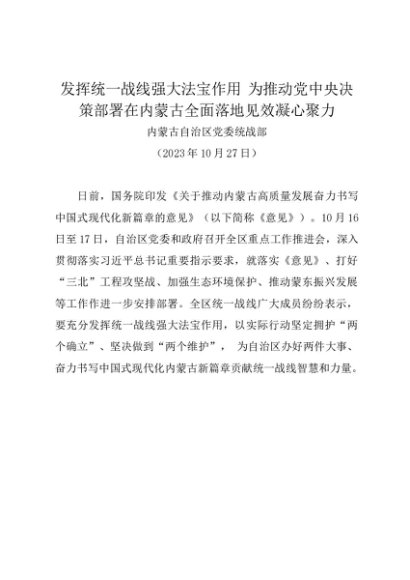 / 交流发言:20231027内蒙古统战部学习《关于推动内蒙古高质量发展奋力书写中国式现代化新篇章的意见》发言材料(8篇)
